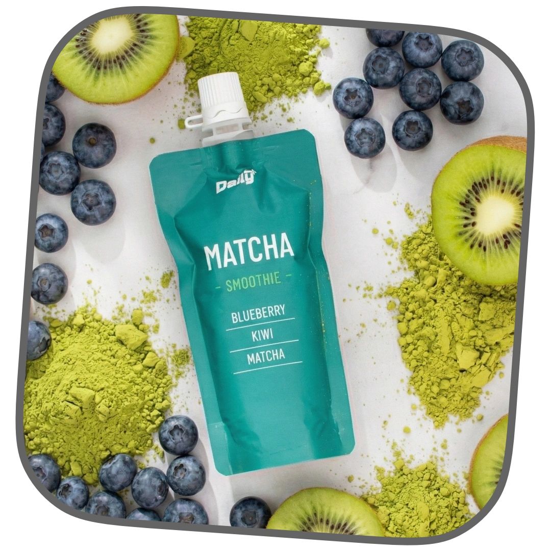 Daily+ Matcha Smoothie er en funktionel smoothie på 50 g, der blander den fyldige smag af matcha, blåbær og kiwi til en lækker snack på farten. Lavet med 100% UHT-behandlede frugt- og juiceekstrakter, uden behov for køling.