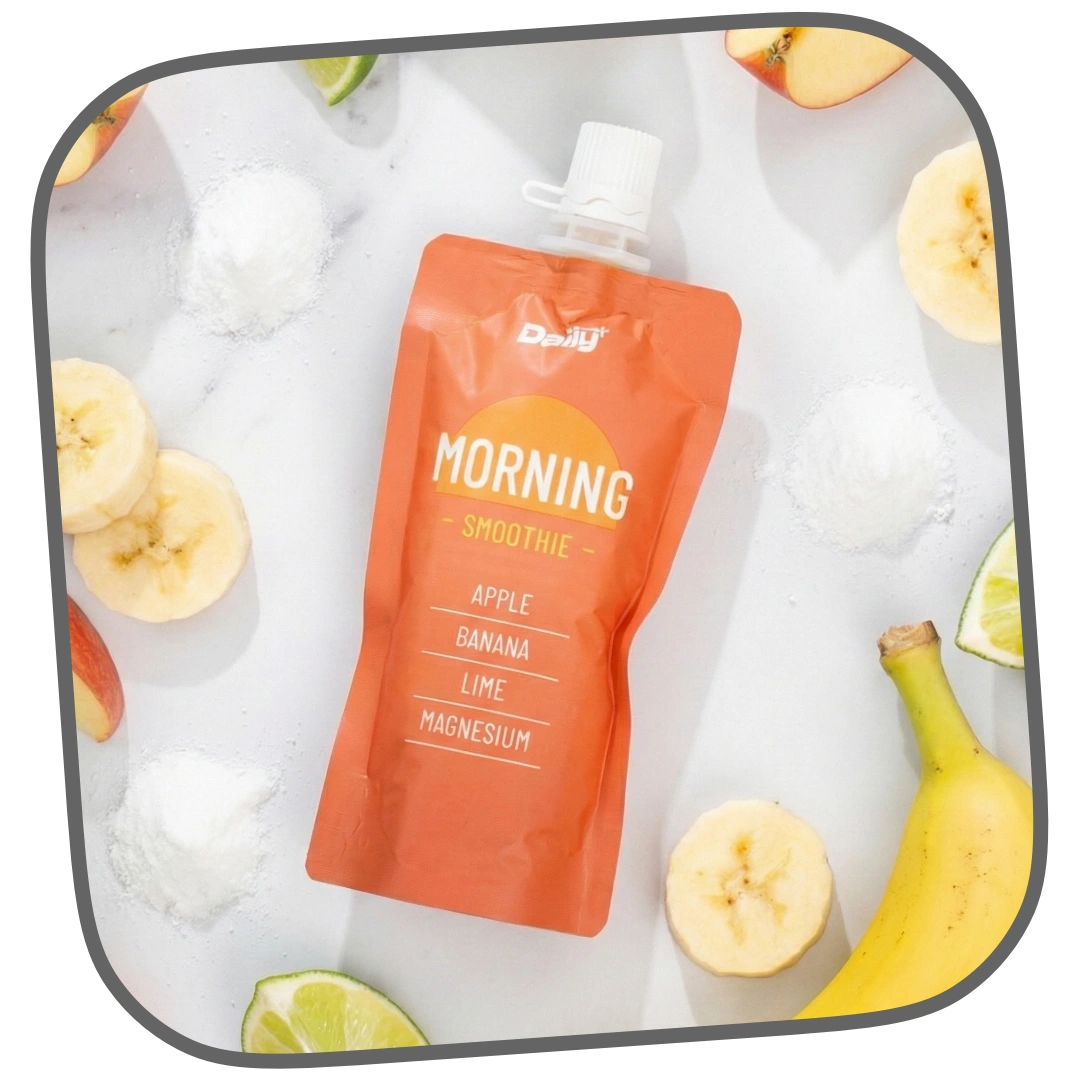 Daily+ Morning Smoothie er en funktionel smoothie på 50 g, der er formuleret til at kickstarte din dag med naturlige ingredienser og tilsat magnesium. Den er lavet med 100% UHT-behandlede frugt- og juiceekstrakter uden behov for køling, hvilket gør den til et nemt og bekvemt valg til travle morgener.